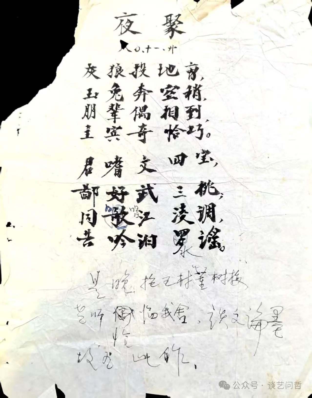 原來,父親是給我們現場出題作文,其意一在鍛煉寫作,二在涵養德性,培育志向。三人現場各有撰作,雖甚粗疏,然獲此庭訓,誠吾輩之幸也!今年寒假,在珠海博雅苑整理父親遺稿,得以檢出1980年父親與鄰村同事董樹梅老師等人的酬唱詩作數則,乃是冬日夜晚到吾村看電影后父親邀來我家的雅集之作。雖不甚工,卻也有趣。至于今日,我依然覺得在貧寒鄉村能有如此文雅之舉,是父親具有高邁文化品格的生動體現,也是“文在鄉野”的有力明證,我要向先君致以崇高敬意!