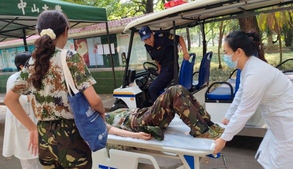 全體醫護人員們以滿腔的熱情與專業的態度,穿梭于訓練場與醫療站點之間,用實際行動詮釋了“醫者仁心”的深刻內涵。從簡單的擦傷到復雜的急癥,每一份不適都被他們細心記錄,妥善處理,確保學生能夠在安全、健康的狀態下環境中完成軍訓任務。更為貼心的是,當遇到需要緊急救治或進一步治療的情況時,醫療團隊會迅速啟動應急預案,由保衛處接應學生,醫護人員通過救護車將學生安全轉診至醫院急診科,確保學生得到及時、專業的救治。這一系列舉措,彰顯了中山大學醫療系統的強大實力與深厚底蘊,也是各附屬醫院團結協作的生動寫照。