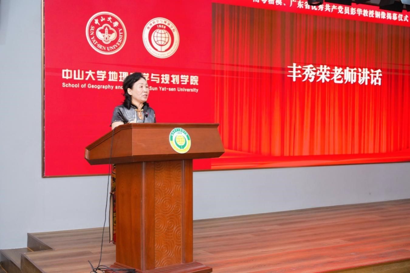 儀式還特別邀請了彭華教授的夫人豐秀榮老師,她表示,在百年校慶之際,彭華銅像的設立和彭華事跡的展覽,弘揚了彭華的崇高品格和高尚師德,影響并激勵更多中大師生,為地理學科的發展和國家建設貢獻更大的力量。她哽咽道:“此刻,我仿佛看見,彭華微笑著又豎起了大拇指,……,為他自己,執著追求,無怨無悔的一生點贊!”在場的每一個人,無不為之動容,眼中閃爍著淚光,心靈深處被這份堅持與熱愛深深觸動。