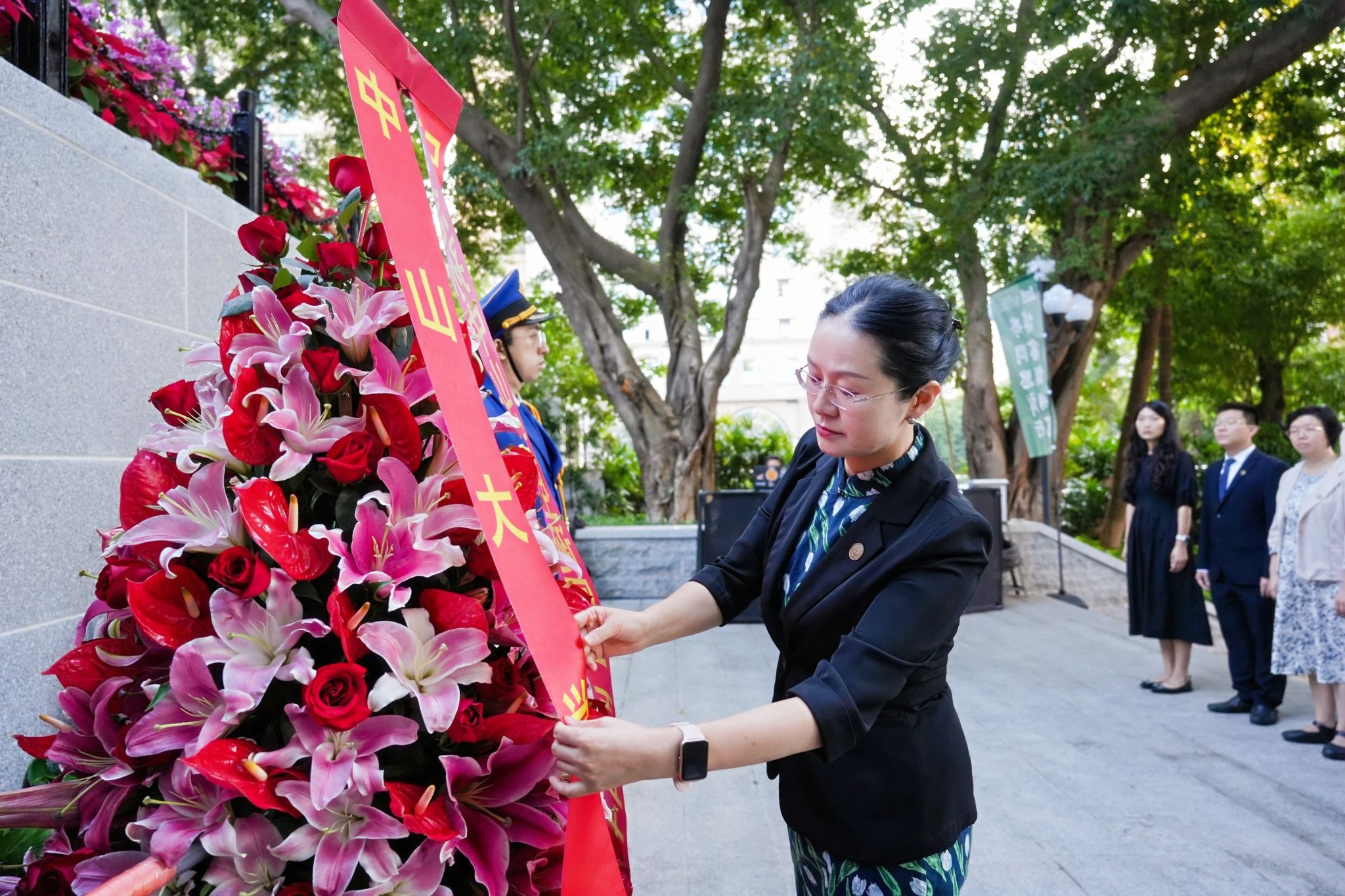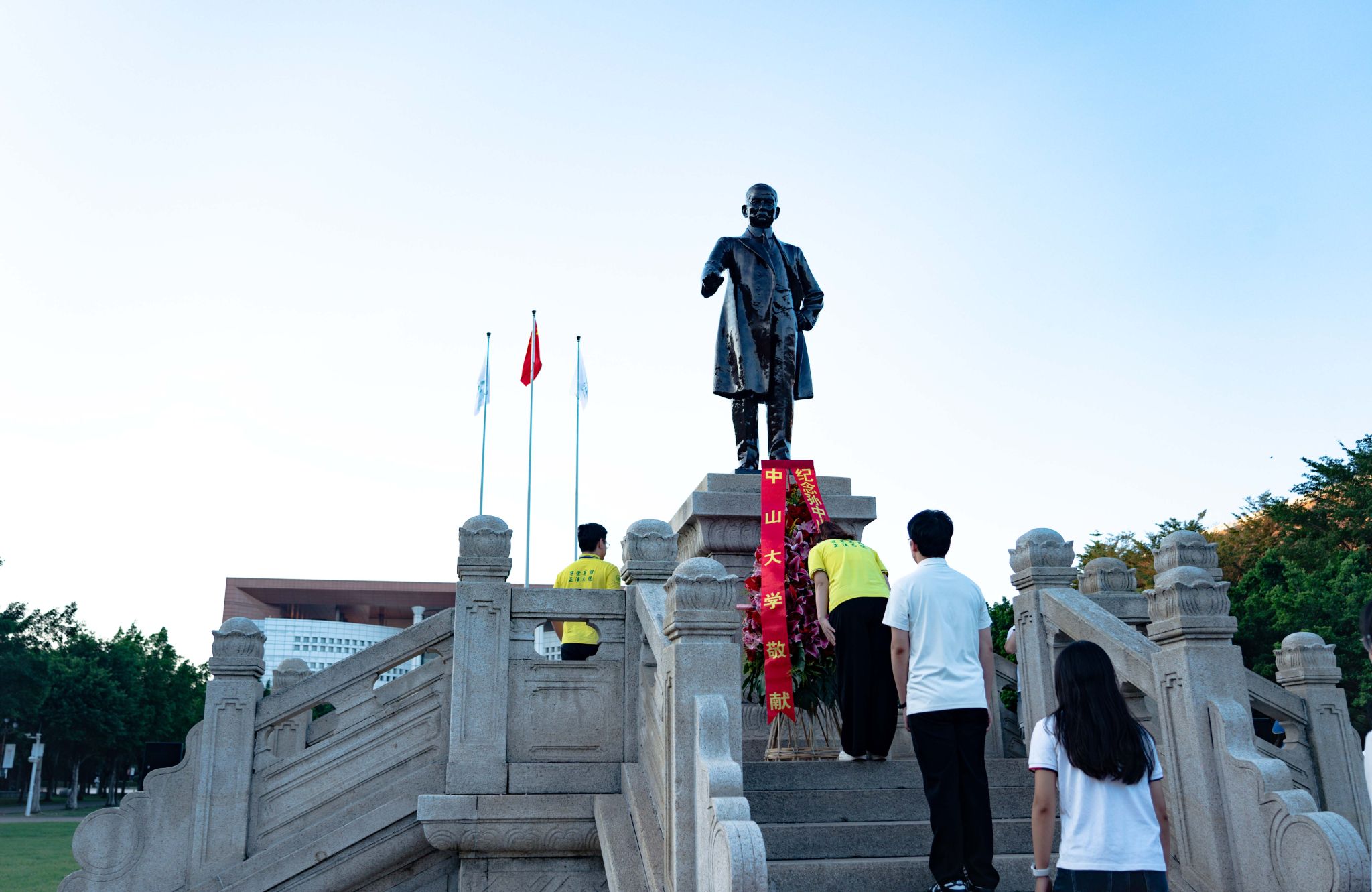 升旗儀式后,敬獻花籃曲響起,國旗班代表將花籃穩步抬至孫中山先生銅像基座前。主禮校領導緩步上前,仔細整理花籃緞帶。紅色緞帶上印著“紀念孫中山先生誕辰一百五十八周年”,寄托了全體中大人對中山先生的深切緬懷和崇高敬意。隨后,全體人員向中山先生銅像行鞠躬禮。主禮校領導帶領在場師生代表肅穆繞行,瞻仰先生銅像。