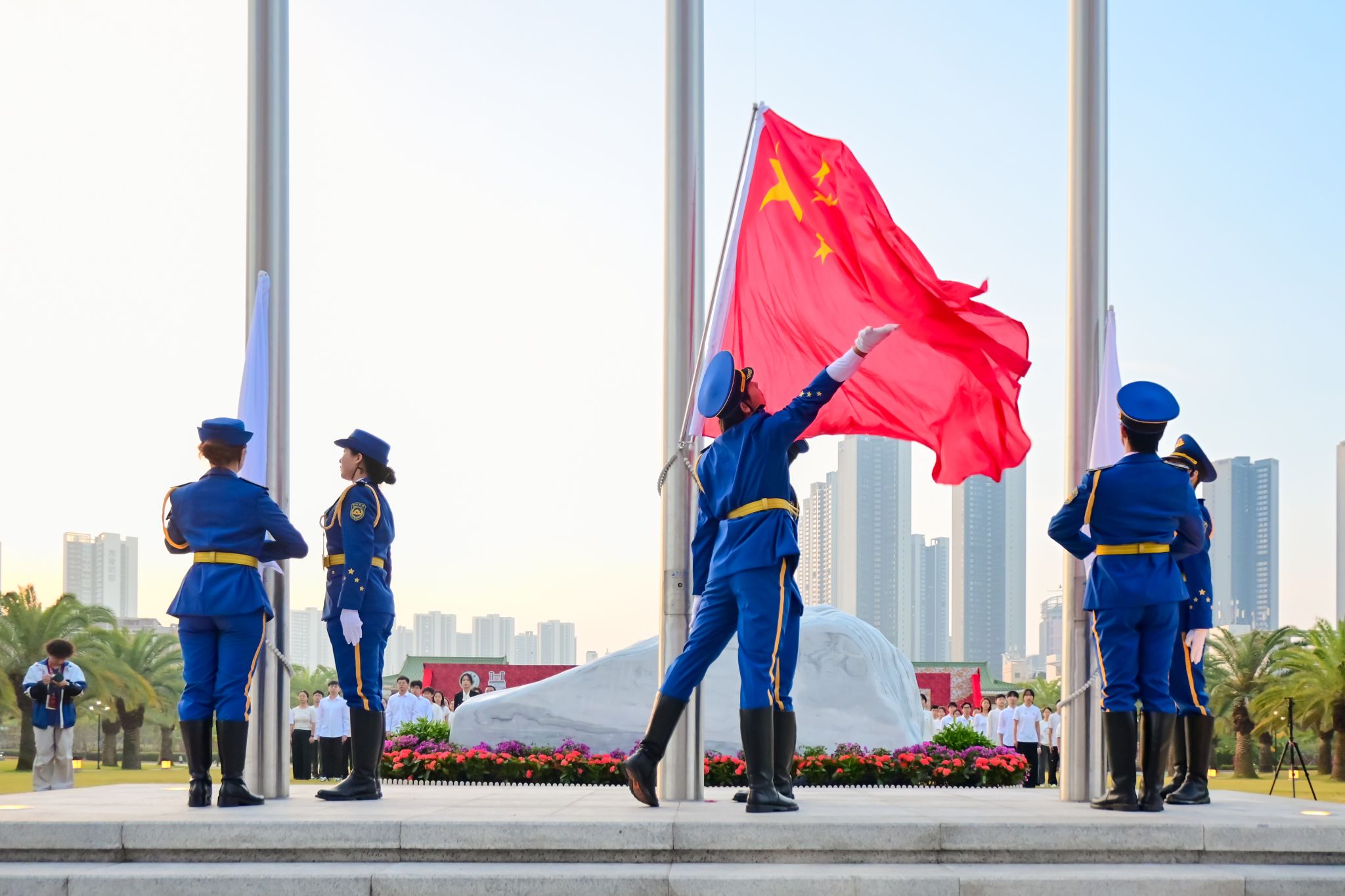 陽光明媚,秋意盎然。伴隨著莊嚴的國歌與激昂的校歌旋律,五星紅旗與中山大學校旗依次緩緩升起,在秋風中獵獵作響,全場師生共同肅立,投以莊重而充滿敬意的目光,氛圍莊嚴而神圣。