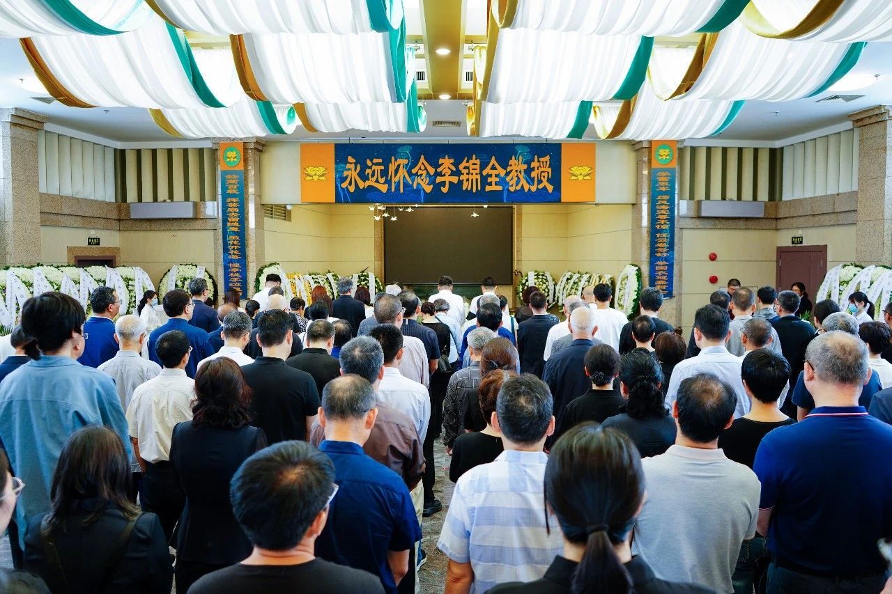 告別廳內莊嚴肅穆,四周擺滿了各界人士敬獻的花圈。李錦全教授的遺體安臥在鮮花綠柏叢中,子女及一眾親友家屬的花圈擁簇四周。挽聯由中國語言文學系黃天驥教授撰寫,“學富五車,歷風濤寵辱不驚,任云卷云舒,舉國衣冠嘉哲士;齡高百載,揮葵扇去留隨意,雖花開花落,惺亭桃李泣良師。”橫幅是“永遠懷念李錦全教授”。