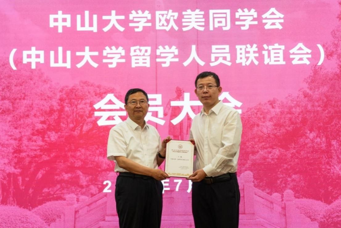中山大學(xué)校長(zhǎng)、廣東歐美同學(xué)會(huì)會(huì)長(zhǎng)高松為新一屆理事會(huì)執(zhí)行會(huì)長(zhǎng)王猛教授(右)頒發(fā)證書 黨委宣傳部張楚翊攝