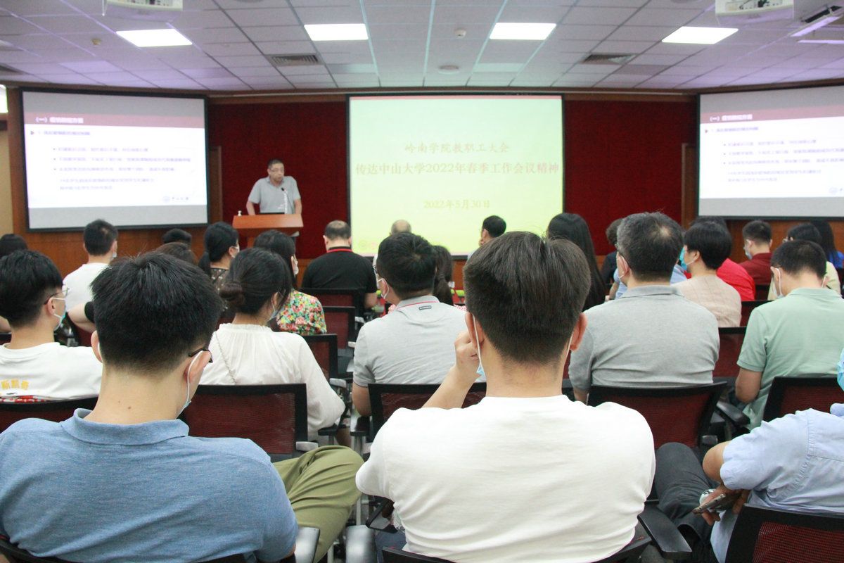 中大新聞網(wǎng)廣州6月16日電(通訊員黃奕楨)5月30日下午,嶺南學(xué)院在嶺南堂三樓講學(xué)廳召開全院教職工大會,傳達(dá)學(xué)習(xí)中山大學(xué)2022年春季工作會議精神。中山大學(xué)副校長兼嶺南學(xué)院院長李善民以及學(xué)院黨政班子成員、各黨支部書記、教研室主任、行政部主任等學(xué)院全體教職員工參加了會議。會議由學(xué)院黨委書記黃毅主持。