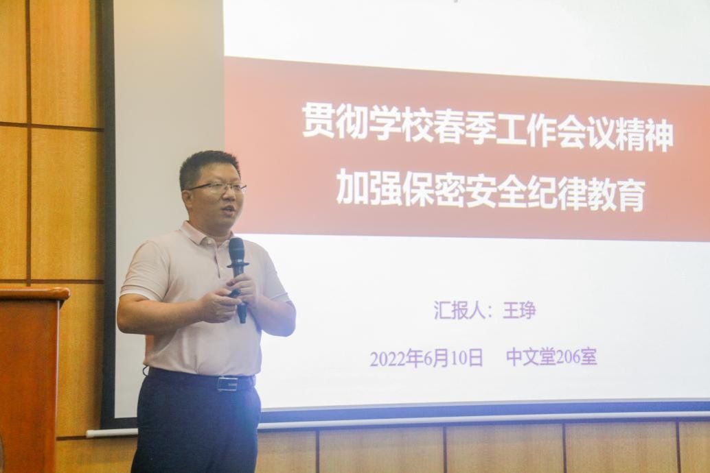 王琤書記帶領全體教職工重溫了習近平總書記“四有”好老師的要求,他表示,中文系要貫徹落實春季工作會議精神,堅持黨的領導,結合新形勢、新挑戰,做好高層次人才引進和培養工作,深入理解通識教育與專業教育相融合、學科交叉融合等對人才培養工作的重要意義,深刻把握好國際化國際合作辦學和扎根中國大地辦學的辯證關系。王琤書記還對全體教職員工進行了保密、安全、紀律和師德警示專題教育。