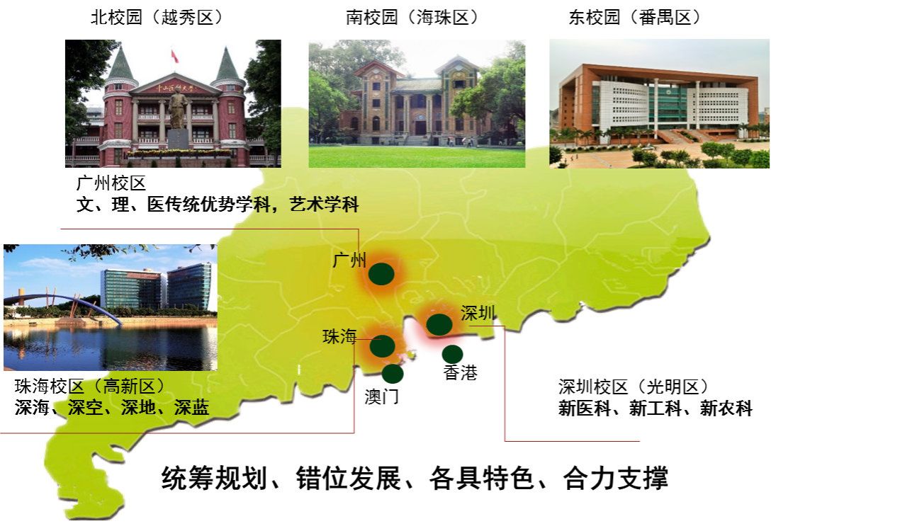 夯實“三校區五校園”辦學格局。與珠海、深圳簽署協議進一步加強戰略合作,完善“三校區五校園”辦學格局。廣州校區加強文理醫傳統優勢學科、藝術學科;珠海校區聚焦深海、深空、深地、深藍;深圳校區強化新醫科、新工科、新農科。五年來先后新建16個學院,形成“文理醫工農藝”綜合發展的學科格局。加強宏觀規劃和頂層設計,編制了學校“十四五”規劃和新一輪“雙一流”建設方案,為學校未來發展指明方向;學校首輪“雙一流”建設成效顯著,所有評價指標均位列第一檔;學校和11個學科繼續入選新一輪“雙一流”建設行列;新一輪學科評估取得歷史性突破。