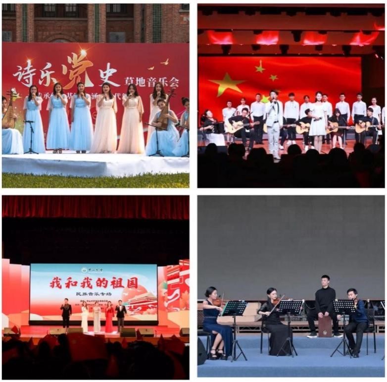 為慶祝中國共產黨成立100周年,在師生中開展黨史學習教育,弘揚偉大建黨精神,弘揚中華優秀傳統文化,致敬偉大新時代,學校舉辦了系列以黨史為題材的藝術活動。2021年舉辦“詩樂黨史”草地音樂會,“弦樂四重奏”草地音樂會、“我和我的祖國”民族音樂專場音樂會、“在燦爛陽光下”系列草地音樂會等9場活動,覆蓋三校區五校園全體師生員工,提升校園文化氛圍。在草地音樂會系列活動中,融入了大量傳統民樂表演,以民族音樂為載體,開展浸潤式美育,弘揚中華優秀傳統文化。