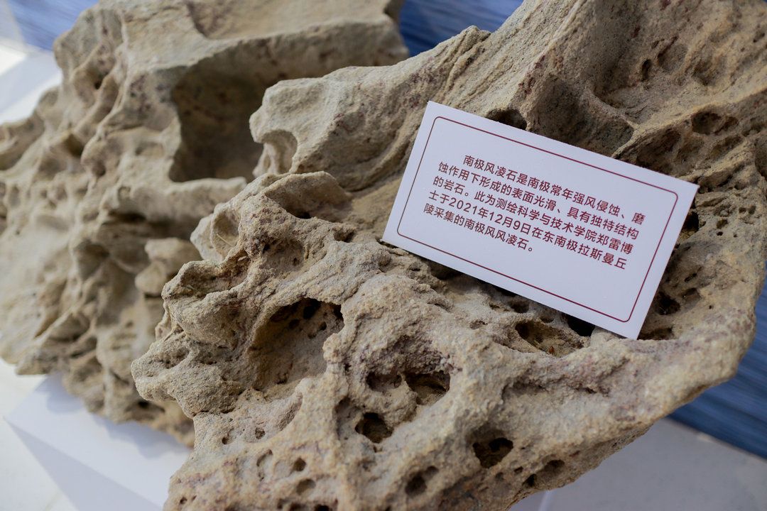 此次展覽展出的南極風凌石,是中國第38次南極科學考察隊隊員、測繪科學與技術學院鄭雷博士于2021年12月9日在東南極拉斯曼丘陵采集。南極風凌石是南極常年強風侵蝕、磨蝕作用下形成的表面光滑、具有獨特結構的巖石,蘊藏了地質歷史時期南極氣候環(huán)境信息。
