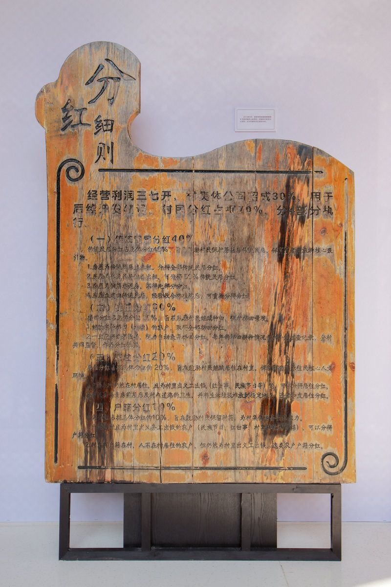 木牌曾置于云南省紅河州元陽縣阿者科村口處,是中山大學旅游學院保繼剛教授團隊發(fā)起的旅游減貧公益項目——“阿者科計劃”5年的實物見證。木牌首次制作于2019年3月,上面鐫刻了保教授團隊為阿者科村制定的分紅規(guī)則。