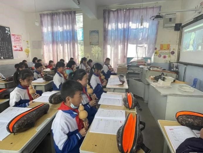 陽光透過淡粉色的窗簾映亮了整間教室,孩子們端坐在座位上,手持葫蘆絲練習《月光下的鳳尾竹》,抬頭專注地聆聽老師的講解,不時低頭打量桌上的樂譜,悠揚飄逸的樂聲回響在每一個角落,讓人恍惚間如置身在月下竹林。這樣如詩如畫的場景,不是發生在城里某個興趣班,而是在大山深處的村小里。若有人駐足往教室里看去,就會驚訝地發現教孩子們吹葫蘆絲的老師不在講臺,而在千里之外的云端線上。