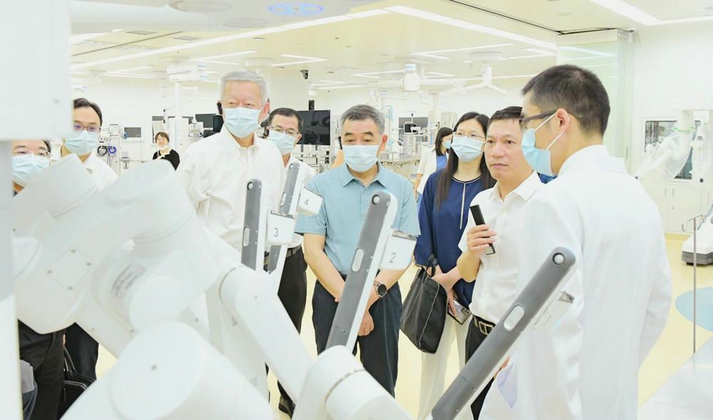 陳春聲書記陪同指導組一行參觀國際機器人手術培訓中心(附屬第一醫院 劉星亮 攝)