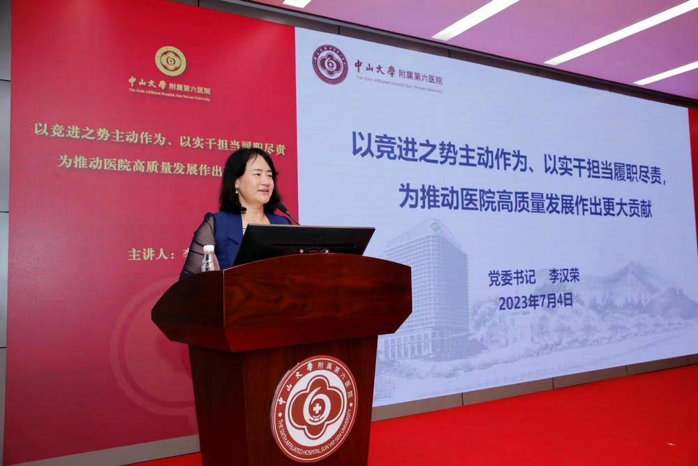 7月4日下午,附屬第六醫院黨委書記李漢榮以《以競進之勢主動作為、以實干擔當履職盡責,為推動醫院高質量發展作出更大貢獻》為題,面向醫院各行政后勤教職工黨支部黨員、中層干部代表,講授主題教育專題黨課。中山大學主題教育巡回指導組第九組成員、中山大學黨委巡視工作辦公室專職巡視員胡國方出席會議。
