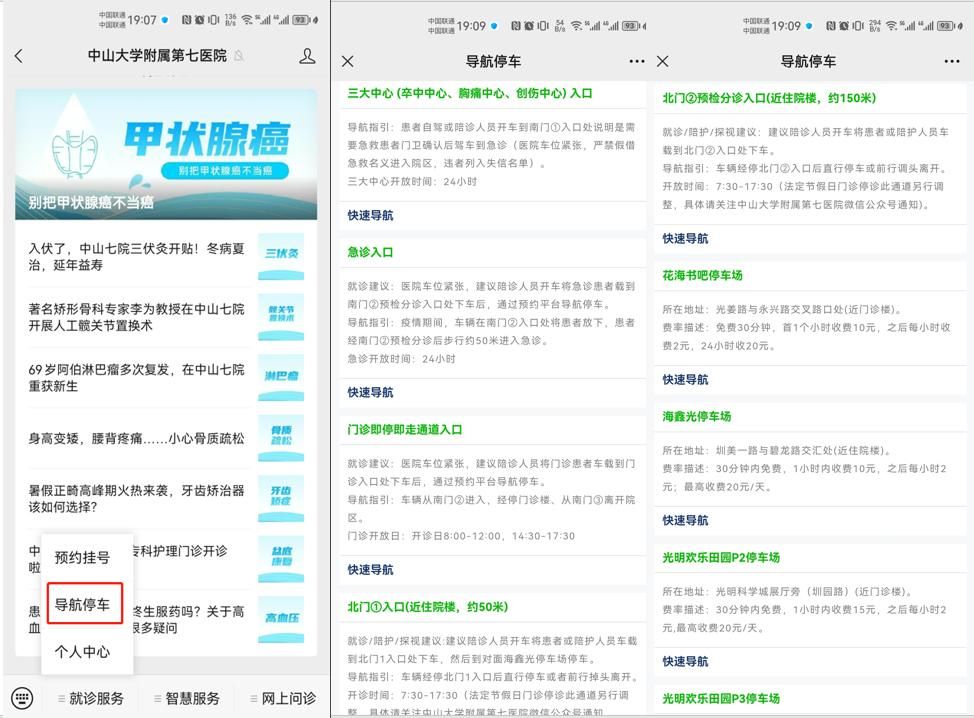 為推進智慧化醫(yī)院建設(shè),附屬七院還在公眾號上推出了“導航停車”小程序,其根據(jù)醫(yī)院功能區(qū)和周邊停車場位置不同,備注說明離院距離和注意事項,從源頭提醒告知患者和家屬根據(jù)不同需求前往接送患者和停車。
