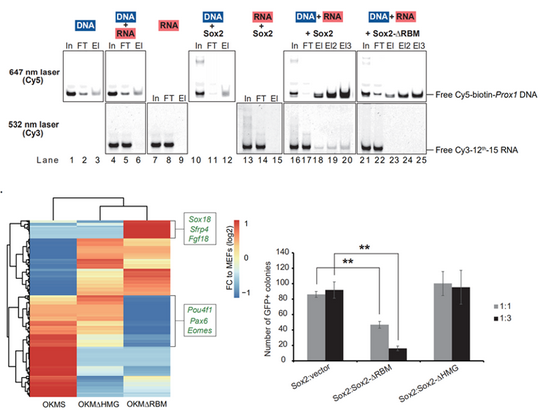 課題組研究人員通過PAR-CLIP和RNA SELEX確認了Sox2與RNA直接相互作用,進一步的測序分析發現Sox2偏好性結合一個CCCY核心基序和一個CGCG的二級基序。隨后,研究人員利用EMSA和RNA免疫沉淀(RNA-immunoprecipitation assay)等手段確定了Sox2的RNA結合結構域(RBM),該結構域具有優先結合富含GC的RNA序列的特征。另外,通過RNA fishing實驗和競爭性結合實驗等的進一步分析,發現在DNA和RNA共同存在的情況下,Sox2使用其HMG結構域結合同源DNA序列,并同時利用RBM結構域在體外介導三元RNA/Sox2/DNA復合物的形成。除此之外,通過比較Oct4、Klf4、c-Myc (OKM)“雞尾酒”以及不同Sox2突變體誘導下iPSC生成的效率發現,刪除Sox2 的RBM結構域會影響iPSC的生成,并且顯著地改變了體細胞重編程過程中的選擇性剪接事件。