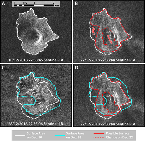 2018年12月22日因無預警海嘯致使印尼蘇達海峽沿岸城市437人死亡,幾千人受災。葉玲玲教授等利用印尼的寬頻帶地震波數據,發現此次海嘯由滑坡引發,與2018年活躍的Anak Krakatau火山活動有關。相對于地震滑動,滑坡造成的地振動以低頻成分為主,高頻成分較少(圖1),造成目前常規基于高頻地振動信號的地震-海嘯預警系統失效。雷達影像資料分析進一步證實海嘯源是Anak Krakatau火山西南側的滑坡(圖2)。采用震源單力模型,長周期地震波觀測約束滑坡平均傾角為12°;結合地震波和衛星遙感資料觀測,得到滑動體積約為0.2 km3。這些參數為海嘯模擬提供了重要約束。