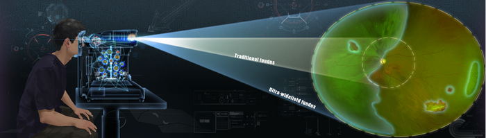 眼底是眼球的后段,由視網膜、視乳頭、黃斑和視網膜中央動靜脈等組成。眼底檢查常需要散瞳,耗費時間長;傳統眼底照相范圍僅有30°~45°視野,可能會出現漏診。中山眼科中心林浩添教授研究團隊采用的超廣域眼底成像范圍為200°~240°,能有效觀察到周邊視網膜病變,可以更早、更準確的檢查出全周視網膜的病變。