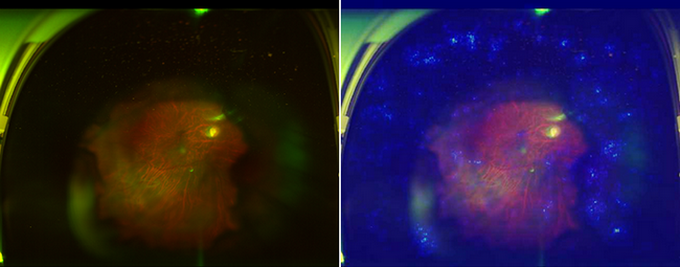 超廣域眼底彩照人工智能眼病篩查系統:圖中右側高亮區域為篩選出來的病變