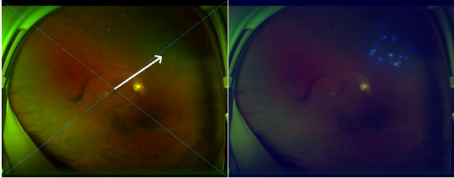 左側圖片箭頭指處為視網膜脫離,右側圖片高亮區域熱圖提示視網膜脫離的精確位置