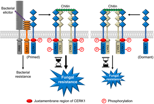 李劍峰教授團(tuán)隊(duì)的研究首次發(fā)現(xiàn)擬南芥BAK1和CERK1分別作為共受體的兩條過去認(rèn)為彼此獨(dú)立的免疫信號轉(zhuǎn)導(dǎo)通路存在信息流動(dòng)(crosstalk),并因此產(chǎn)生細(xì)菌誘導(dǎo)的真菌抗性。同時(shí),該研究首次發(fā)現(xiàn)植物受體激酶可通過近膜區(qū)磷酸化進(jìn)入一種介于“失活”和“激活”的中間狀態(tài),即“警戒”(primed)狀態(tài)。值得注意的是,茄科植物本氏煙的CERK1因?yàn)榻^(qū)沒有對應(yīng)擬南芥CERK1的可磷酸化位點(diǎn),不能響應(yīng)flg22進(jìn)入警戒狀態(tài),而擬南芥的CERK1卻能在本氏煙細(xì)胞中受flg22誘導(dǎo)進(jìn)入警戒狀態(tài),提示通過基因編輯改造農(nóng)作物自身CERK1的近膜區(qū)使之獲得對應(yīng)擬南芥CERK1的可磷酸化位點(diǎn),有望成為提升農(nóng)作物廣譜真菌抗性而又不會(huì)造成持續(xù)生長抑制的新策略。