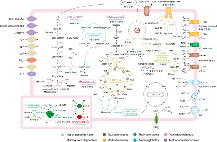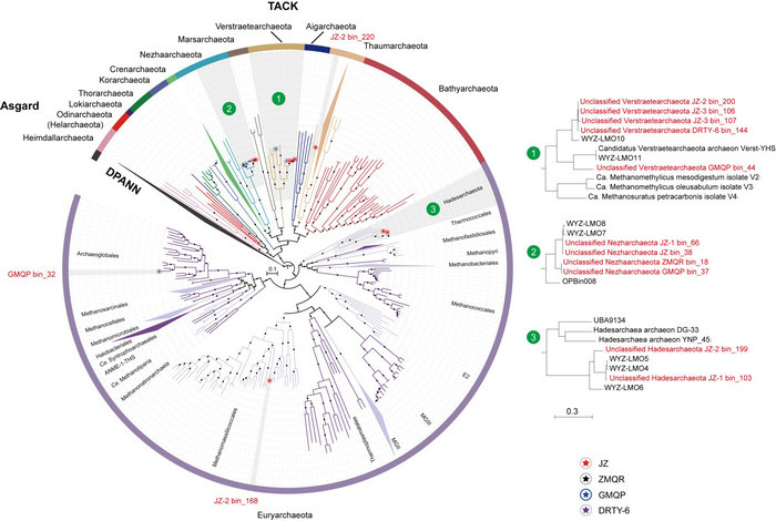 甲烷是地球上重要能源物質(zhì),具有極高的工業(yè)應(yīng)用價(jià)值,同時(shí)也是一種溫室氣體,對諸如碳素的生物地球化學(xué)循環(huán)和全球氣候變化有著深遠(yuǎn)影響。已有研究表明微生物介導(dǎo)的產(chǎn)甲烷作用主要由廣古菌門(Euryarchaeota)中少量支系完成,近期研究卻發(fā)現(xiàn)除傳統(tǒng)的廣古菌門外,其它古菌門中,如深古菌門(Bathyarchaeota)、韋斯特古菌門(Verstraetearchaeota)等也發(fā)現(xiàn)相關(guān)微生物具有甲烷代謝能力。即便如此,人們對未知甲烷代謝古菌的探索仍少之又少,其生態(tài)功能以及進(jìn)化起源也尚未可知。