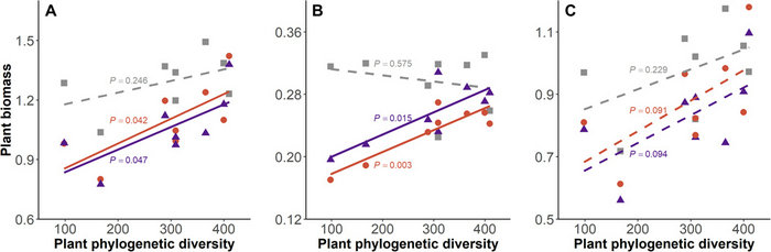 近日,我校生命科學學院余世孝教授課題組在國際知名學術期刊Science Advances(IF=12.8)上在線發表了題為“Soil microbes drive phylogenetic diversity-productivity relationships in a subtropical forest”的研究論文。該研究論文闡明了不同親緣關系樹種共存時譜系多樣性對群落生產力的影響,并首次揭示了土壤病原菌在驅動森林群落多樣性-生產力關系中的關鍵作用。生命科學學院特聘研究員梁敏霞博士為論文的第一作者,余世孝教授和劉徐兵副教授為共同通訊作者。