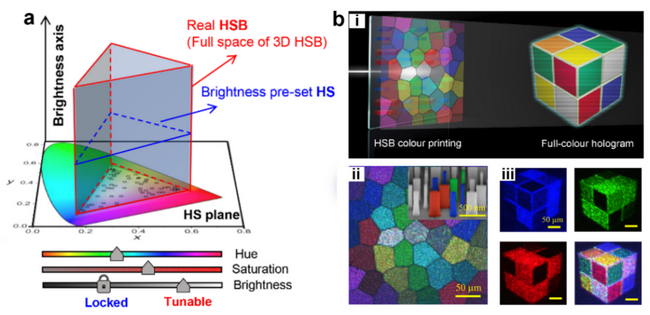 近日,我校物理學院王雪華教授和團隊成員周張凱副教授、包燕軍研究員等提出一種能有效克服上述兩個功能缺失的方法。基于團隊前期發展的相干相位設計理念(Adv. Funct. Mater. 28, 1805306,2018),他們設計兩個硅納米棒作為超構表面的基本相干像素結構單元,從而實現光場透射的有效調控。通過獨立控制兩個納米棒的轉角,可以實現單層結構對振幅和相位的獨立調控,從而能夠在單層納米結構上實現任意全息與平面圖像的集成。更進一步,針對于彩色平面圖像,可以通過硅納米棒的尺寸(即單根納米棒的長和寬)以及納米棒之間的轉角差的控制,實現對顏色HSB三參數的按需調控,從而將超構表面結構色的調控能力從二維的色度-飽和度平面,真正拓展到三維的色度-飽和度-強度空間(如下圖)。