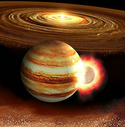 行星胚胎與木星發生了碰撞(藝術想象圖)。 [圖片來源:日本天體生物學中心]