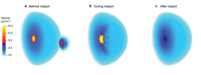 具有原初致密核的木星與一個十倍地球質量的行星胚胎發生碰撞,結果導致稀釋核