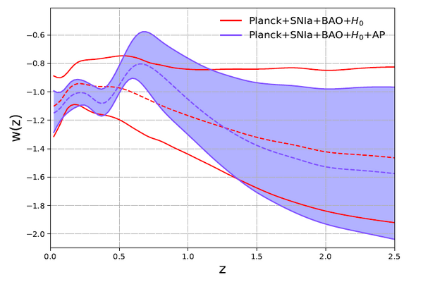 域),加入“切片AP”方法的結果(藍色區域)把低紅移的精度提高了一倍,并呈現出“動力學暗能量”(w不是常數)的微弱信號。