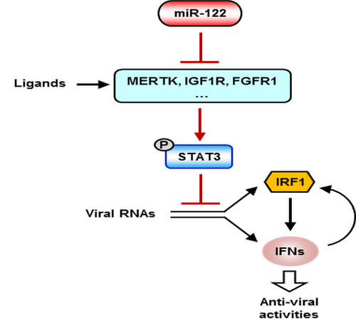 固有天然免疫反應(Intrinsic innate immune responses)是我們體內每一種細胞都具有的抵抗病毒等病原體侵害的天然免疫防御功能。由于它是一切免疫應答的基礎,因此也被稱為免疫的第一道防線。不同類型的細胞,特別是上皮細胞中天然免疫的生成及其調控目前并不清楚。microRNA-122是肝細胞中特異性高豐度表達的微小RNA分子,而在肝癌細胞中表達顯著下調或者缺失。屈良鵠教授課題組發現:在肝癌細胞HepG2中導入microRNA-122可以極其顯著地增強細胞應對各種病毒核酸(包括HCV和HBV)的天然免疫反應。研究發現microRNA-122可以直接靶向多種受體酪氨酸激酶(RTK),從而降低了HepG2細胞中STAT3的酪氨酸磷酸化水平。更有趣的是,他們發現STAT3可以直接抑制干擾素調節因子IRF1的表達,STAT3酸磷酸化水平的下調解除了STAT3對干擾素轉錄激活的抑制,從而使得干擾素信號通路在病原體入侵時能迅猛激活。該研究揭示了在肝細胞中miR-122–RTKs/STAT3–IRF1–IFNs通路調控干擾素表達的重要途徑,闡明了微RNA對肝細胞等非免疫細胞天然免疫能力調控的新機制。