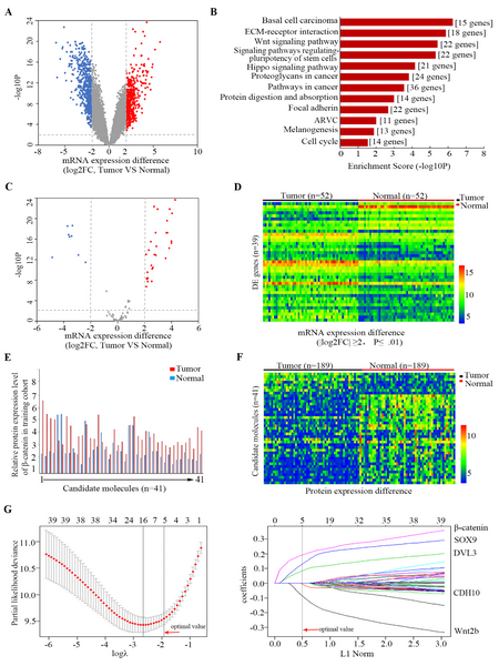 該研究旨在探索發(fā)育組信號(hào)通路在驅(qū)動(dòng)基因陰性肺腺癌中的作用,并探尋與驅(qū)動(dòng)基因陰性肺腺癌患者預(yù)后顯著相關(guān)的分子,以期為此類(lèi)預(yù)后差的病人提供新的治療靶點(diǎn)。實(shí)驗(yàn)分為3大部分:發(fā)現(xiàn)階段、實(shí)驗(yàn)階段以及驗(yàn)證階段。在發(fā)現(xiàn)階段,課題組利用全基因組芯片對(duì)52對(duì)驅(qū)動(dòng)基因陰性肺腺癌腫瘤組織和相鄰正常組織進(jìn)行候選基因的篩選,通過(guò)KEGG信號(hào)通路富集分析發(fā)現(xiàn)Wnt/β-catenin信號(hào)通路在驅(qū)動(dòng)基因陰性肺腺癌中高度激活,并得到41個(gè)Wnt/β-catenin信號(hào)通路相關(guān)的差異表達(dá)基因。在實(shí)驗(yàn)階段,課題組運(yùn)用組織芯片技術(shù)(TMAs)和LASSO Cox回歸分析進(jìn)一步對(duì)41個(gè)候選基因進(jìn)行篩選,最終構(gòu)建了一個(gè)由CTNNB1、SOX9、DVL3和Wnt2b組成的預(yù)后相關(guān)classifier(CSDW)。依據(jù)CSDW classifier,驅(qū)動(dòng)基因陰性肺腺癌患者可被分為高風(fēng)險(xiǎn)組和低風(fēng)險(xiǎn)組,并且高風(fēng)險(xiǎn)患者的總生存率顯著差于低風(fēng)險(xiǎn)患者([HR]10.42,6.46-16.79;p<0 .001)。在驗(yàn)證階段,課題組收集了內(nèi)部驗(yàn)證組樣本和兩個(gè)獨(dú)立的外部驗(yàn)證組樣本。經(jīng)過(guò)驗(yàn)證分析,csdw classifier被證實(shí)可作為預(yù)測(cè)驅(qū)動(dòng)基因陰性肺腺癌患者預(yù)后的可靠工具,同時(shí)為驅(qū)動(dòng)基因陰性肺腺癌的治療提供新的靶點(diǎn)。