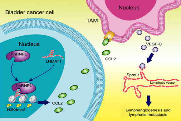 在上述研究工作中,林天歆教授團隊首先鑒定了調控膀胱癌腫瘤微環境相關的長鏈非編碼RNA LNMAT1。LNMAT1能夠促進腫瘤細胞分泌趨化因子CCL2,進而募集TAMs到膀胱癌腫瘤微環境中。被“引誘”而來的TAMs能夠分泌參與膀胱癌淋巴管生成過程的VEGF-C,幫助腫瘤細胞發生淋巴轉移。由此可見,如果能介導到腫瘤微環境這片“土壤”,干預膀胱癌“幫兇”LNMAT1的表達,將能改變“種子”的生存情況,對抑制膀胱癌的進展、改善患者的生存預后發揮重要價值。林天歆教授團隊首次闡明LNMAT1介導腫瘤微環境的重要作用及通過與趨化因子CCL2協同調控TAMs的分子機理,對認識膀胱癌淋巴轉移的發生發展的機制有重要意義。
