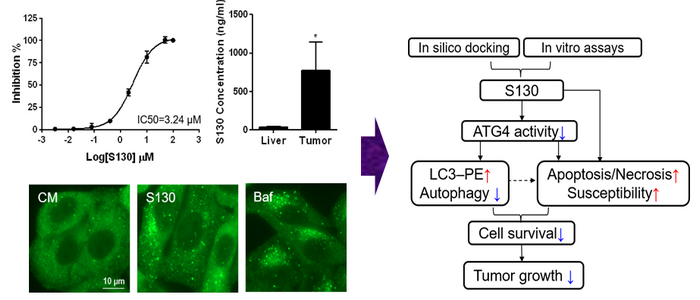 該文章以自噬關鍵蛋白ATG4B為靶點,通過計算機虛擬篩選和建立熒光共振能量轉移的體外高通量篩選體系,篩選得到新型的ATG4B小分子抑制劑S130。通過對自噬信號通路的研究,發(fā)現(xiàn)S130不影響自噬體功能及其與溶酶體的融合,而是抑制了LC3-PE的去脂化過程,最終阻斷細胞自噬。這為進一步明確ATG4B在自噬信號通路中的調控作用提供了新的理論基礎。通過抗腫瘤作用的研究,發(fā)現(xiàn)S130可有效抑制結腸癌細胞的生長,且營養(yǎng)缺乏能進一步增強S130的抗腫瘤效果,而過表達ATG4B可部分對抗S130引起的腫瘤細胞死亡,提示ATG4B可能是腫瘤治療中的潛在靶點。同時,藥代動力學實驗結果表明,該抑制劑在體內主要分布于腫瘤組織,從而抑制結腸癌細胞的生長。綜上,該研究表明ATG4B可能是腫瘤治療的潛在藥物靶標,而S130作為高效的ATG4B小分子抑制劑具有開發(fā)成為腫瘤治療藥物的潛能。