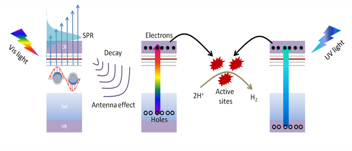 在此基礎(chǔ)上,他們?cè)贚AL非晶化中添加甲醇,實(shí)現(xiàn)了二維非晶NiO納米片的氫摻雜,進(jìn)一步增強(qiáng)了電子摻雜濃度,制備出具有表面等離激元效應(yīng)的二維非晶NiO納米片,并且等離激元共振峰位和強(qiáng)度可以由甲醇的濃度進(jìn)行調(diào)控。實(shí)際上,引入等離激元效應(yīng)的二維非晶NiO納米片是一種“天線—反應(yīng)器一體化”的光催化劑結(jié)構(gòu)(an incorporate antenna-reactor plasmonic structure),能夠?qū)崿F(xiàn)雙通道光催化即紫外光激發(fā)下的帶間躍遷和可見光激發(fā)下的等離激元天線作用,極大地提高了二維非晶NiO光催化的效率,其光催化分解水制氫性能提高了將近20倍。