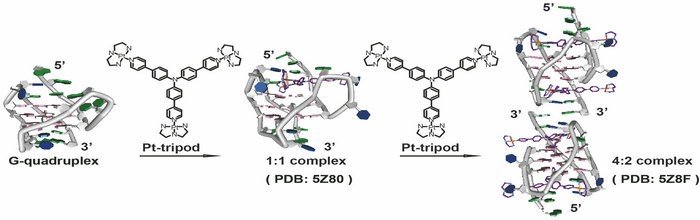Pt-tripod與人體端粒G-四鏈體Tel26的動態(tài)結合,Pt-tripod逐步誘導Tel26形成