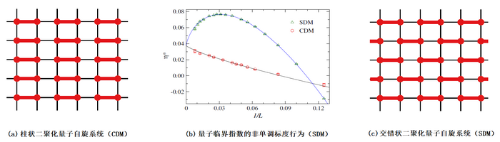 姚道新教授研究組與合作者深入研究了二維二聚化量子自旋系統,通過理論分析和高精度的量子蒙特卡洛方法,發現在交錯狀二聚化量子海森堡模型中,相變臨界指數具有新奇的非單調尺寸標度行為。他們通過在有限尺寸標度理論中引入兩個驅動場,同時進行大尺寸的計算分析,成功地解釋了非單調的量子蒙特卡洛結果,從根源上指出二維二聚化量子自旋系統的相變仍然屬于O(3)普適類,適用于量子-經典對應理論。他們的研究表明,在量子相變中可能存在多個驅動場導致的新奇標度行為,需要采用正確的標度理論才會得到正確的結果。在論文中,他們還創造性地提出多參數聯動-高階擬合方法,能極大地提高數據準確度,可以用在不同體系的數據分析中。