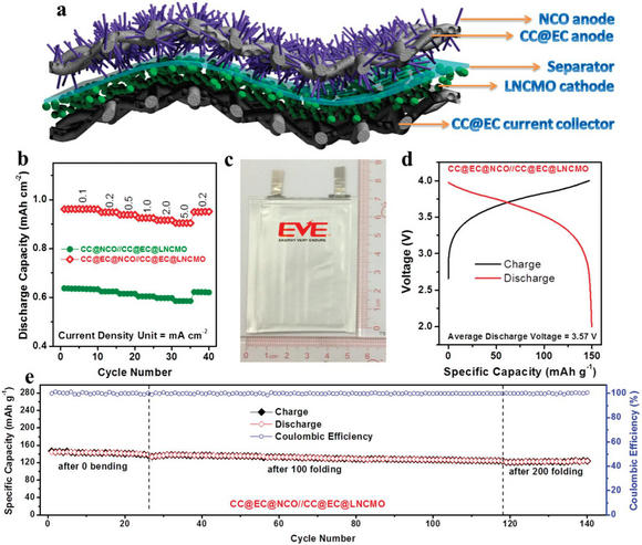 柔性全電池性能圖:(a) 柔性器件示意圖。(b) CC@NCO和CC@EC@NCO為陽極,CC@EC@LNCMO為陰極的全柔性鋰離子電池的倍率性能。(c)CC@EC@NCO//CC@EC@LNCMO 柔性鋰離子電池裝置圖。(d) CC@EC@NCO//CC@EC@LNCMO 柔性鋰離子電池在5 mA時的充放電曲線。(e)CC@EC@NCO//CC@EC@LNCMO 柔性鋰離子電池在不同彎曲次數下的循環穩定性。