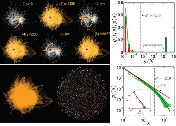 另一方面,基于大量的社會實證數據,耶魯大學社會科學家們發現,個人的影響力大都會局限在其朋友的朋友的朋友之內,如抽煙、酗酒和吸食大麻等行為,也就是著名的“三度影響力”理論。這與需要全局數據的觀點恰好相反,“三度影響力”理論表明,可以從個體的局部網絡結構信息來衡量其在全網上的社會影響力。這兩者看起來相互矛盾的結論引起了一個根本的問題:是否真的可以僅僅只根據局部的網絡結構信息來準確度量個體的全局影響力?在該項研究中,胡延慶副教授與其合作者給出了該問題的具體答案,并且解釋清楚了全局和局域之間的聯系。并發現一個普適的結論:對于初始條件一樣的傳播事件,其傳播范圍只能以一定概率屬于如下兩種情況之一,一個是傳播不開的局域態,即信息傳播很少幾步就終止了;另一個是全局傳播,傳播范圍與網絡規模成正比,等于該傳播概率對應的邊滲流模型中的巨連通集團大小。并且這兩種狀態可以非常明顯地區分出來,由此得到三個重要結果:(1)在在線社交網絡中,個體的傳播力可以被精確地定義為最大連通滲流集團的大小與個體在該連通集團的概率的乘積。這里第一次給出了社交網絡中個體傳播力的簡潔數學方程。(2)任何個體的影響力都可以在特征關聯長度內,僅僅通過局部的網絡結構信息來精確衡量,其誤差會隨該長度成指數衰減。這種現象與物理相變中臨界行為之間有著深刻的理論關聯。(3)基于上述發現,設計了一個優化算法來選擇最具有影響力的個體。該算法不需要知道網絡結構的全局信息,從而其計算時間復雜度與網絡規模無關為一常數。在頂點數量以億為單位的網絡上,該算法時間復雜度比以往最快的貪心算法快上千萬倍,且可以獲得質量極高的優化解。