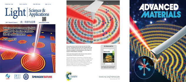 該團隊的研究組提出采用規則幾何納米結構和摻雜來實現光場在納米尺度上的精確局域化和調控,實現了單層石墨烯規則幾何納米結構剪裁中紅外電磁場在單原子二維平面的局域分布、波長與強度調控。通過構建單層石墨烯規則幾何納米結構,利用邊界對表面等離激元波的反射,形成多重干涉效應,實現了對10.7 μm入射波的光場局域化,并且通過納米結構的幾何形狀調控其空間分布,結果以封面文章發表在Light: Science & Applications 2017, 6, e17057上。另外,通過對單層石墨烯進行硝酸根化學摻雜,實現了單層石墨烯表面等離激元強度提高了約2倍、波長由150 nm提高到了280 nm,結果以背封面文章發表在Nanoscale 2016, 8, 16621上。