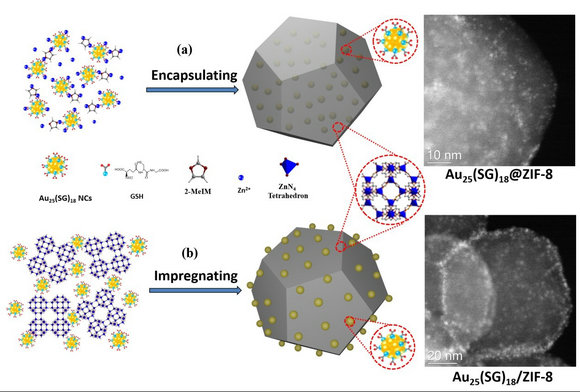 催化劑合成過程示意圖及相應的高角環形暗場掃描透射電鏡圖: a) Au25(SG)18@ZIF-8 (Au25(SG)18組裝入ZIF-8框架內部) ;b) Au25(SG)18/ZIF-8 (Au25(SG)18浸漬在ZIF-8外表面)