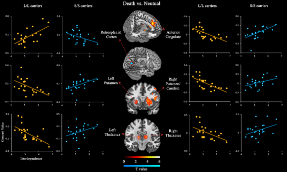 圖2. 5-HTTLPR兩種基因型個體中互依文化價值取向與死亡相關大腦活動的聯系