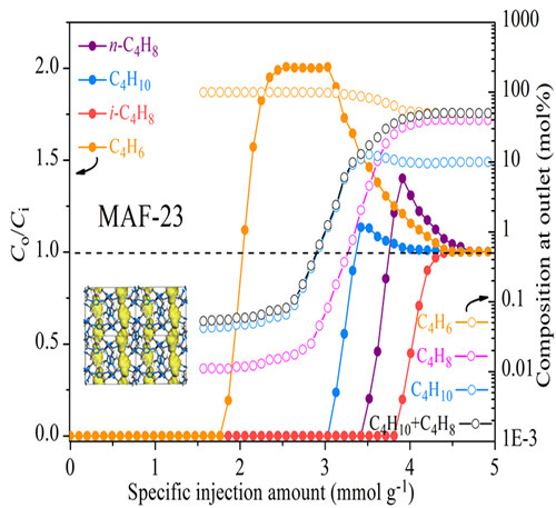 團:研究團隊對10例代表性配位聚合物多孔材料的計算機模擬和實驗結果證實,形狀尺寸合適的離散孔洞最有利于控制柔性客體分子的構型和并反轉吸附選擇性,而連續的孔道對客體分子的吸附擴散又是必須的。通過模擬計算,發現具有準離散孔洞的柔性多孔材料MAF-23在兩種要求中取得平衡,實現了反常而且最優的C4烴類混合物吸附分離順序。常溫常壓下將丁二烯、丁烯、異丁烯和丁烷混合物通過MAF-23填充的固定床吸附裝置后,吸附最弱的丁二烯最先流出而且純度很容易達到99.9%,同時可避免常規純化方法中因加熱而產生的丁二烯自聚問題。相關工作發表于國際權威雜志《科學》上,受到了廣泛的關注。