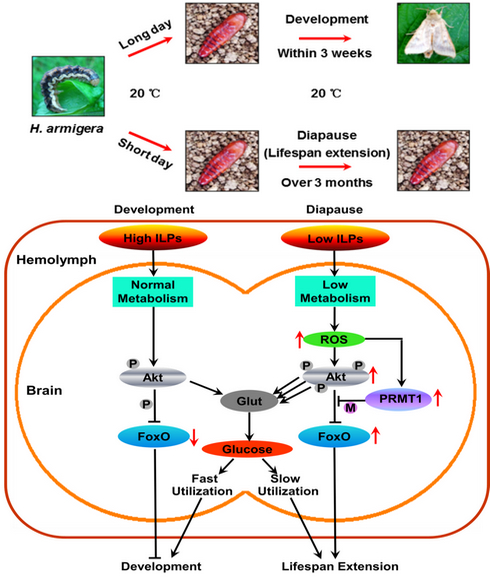 以農(nóng)業(yè)害蟲(chóng)棉鈴蟲(chóng)的滯育(類(lèi)似冬眠,和生命延長(zhǎng)同義)為研究目標(biāo),發(fā)現(xiàn)了第一例自然發(fā)生的、生理水平的ROS作為胞內(nèi)信號(hào)調(diào)節(jié)腦的一個(gè)獨(dú)特的胰島素信號(hào)路徑來(lái)實(shí)現(xiàn)生命延長(zhǎng) (見(jiàn)下圖),證明了生理水平的ROS對(duì)生物體的有益性以及延長(zhǎng)生命的獨(dú)特機(jī)制是本項(xiàng)工作的核心創(chuàng)新點(diǎn)。