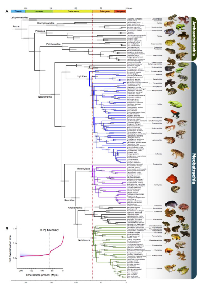 張鵬教授課題組通過與美國學者的合作,收集了全球164個蛙類物種標本,包含了80%的現生蛙類動物科級分類單元。通過對這些蛙類樣本中95個核基因分子標記的分析,張鵬教授課題組發現:(1)現生蛙類起源于2.1億年前的三疊紀末期,糾正了早期研究因包含線粒體基因數據而對蛙類起源時間估算偏大的問題;(2)三個主要現生蛙類動物群類(包含了超過88%的現生蛙類物種):雨蛙超科(Hyloidea)、蛙超科(Natatanura)、姬蛙科(Microhylidae),在白堊紀末期同時經歷了爆發性的物種分化過程,提示大量生物消亡后遺留下的生態位空缺推動了現生蛙類物種多樣性的產生;(3)大滅絕事件對樹棲型蛙類物種的影響要遠遠大于對其他棲息類型蛙類的影響,這與白堊紀末期大滅絕事件摧毀了大部分森林的推斷吻合。這些結果強烈的表明,導致了恐龍消亡的白堊紀大滅絕事件,對蛙類兩棲動物的演化也產生了重要的影響。這一發現從兩棲動物的角度,為白堊紀大滅絕事件對全球生物演化的影響提供了新的證據,進一步支持了“大滅絕后大爆發”的現代進化學說,具有重要的科學意義。