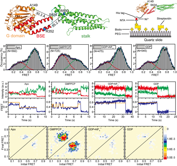 高嵩教授課題組對MxA蛋白進行了多種修飾改造,經過不斷探索嘗試后成功獲得了功能基本不受影響的MxA蛋白單體,并利用X射線晶體衍射技術解析了單體MxA晶體結構。此后,高嵩課題組與中科院生物物理所趙永芳教授課題組合作,根據結構巧妙設計了一系列單分子熒光共振能量轉移的實驗,最終通過這種技術含量極高的生物物理技術在單分子水平上揭示了MxA蛋白在GTP水解過程中實時的構象變化情況。該研究闡明了MxA蛋白在抗病毒作用過程中結構改變的動態過程,有助于全面了解MxA抗病毒的具體分子機制,并對人們了解其他dynamin家族成員的具體作用方式有重要的啟發意義。