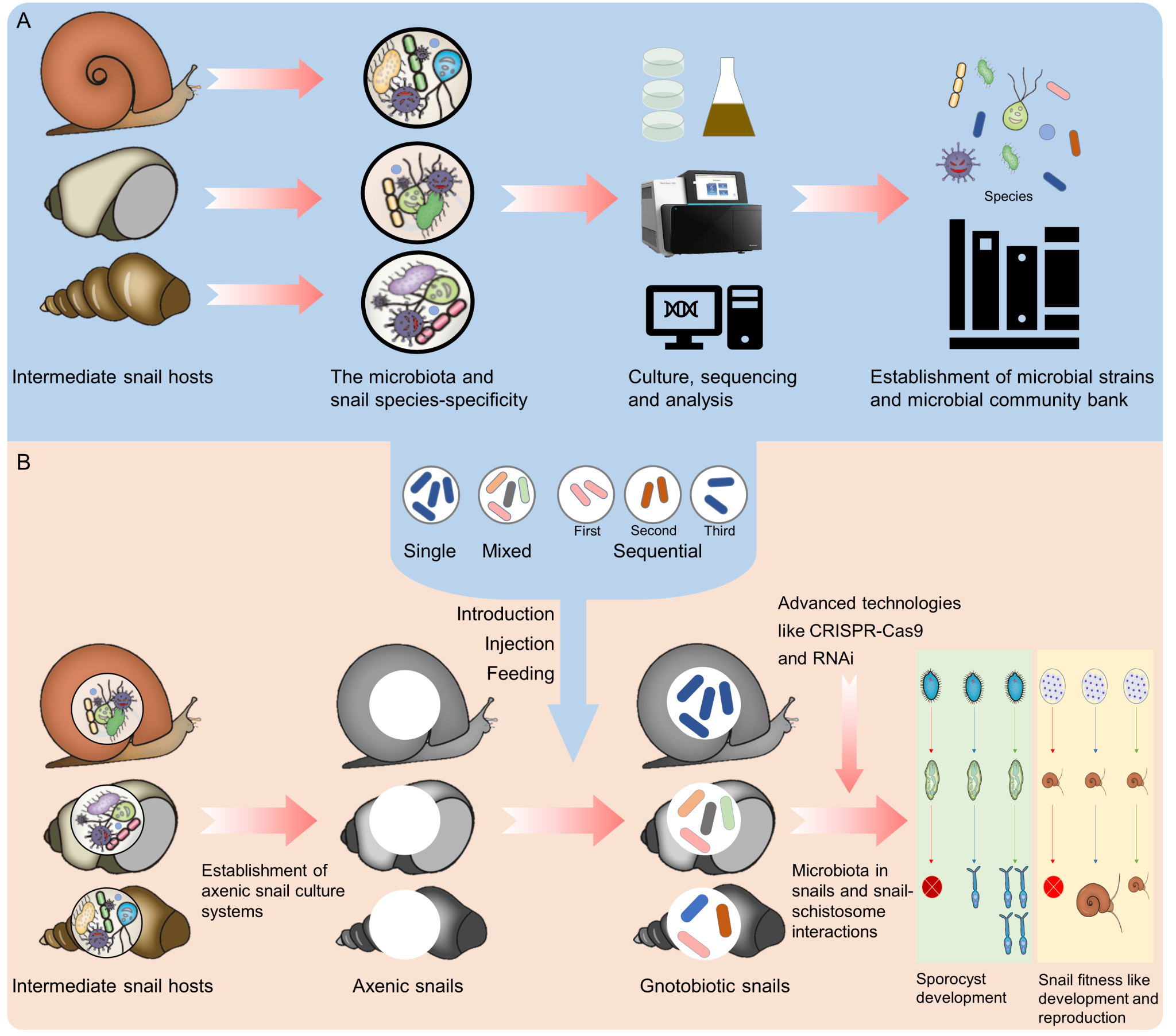 該綜述系統回顧了無菌和限菌技術在螺類研究中的歷史發展,著重介紹了歷史上具有重大意義的無菌螺技術構建以及創新,并從分離技術、滅菌方式、營養供給以及飼養方法等方面評價了近年來發展的無菌和限菌技術;重點討論了無菌和限菌技術作為有價值的研究模型的發展和應用,提出在無菌螺(Axenic snails)和悉生螺(限菌螺,Gnotobiotic snails)模型研究的基礎上,結合多組學技術和基因改造工程技術,探討使用無菌和限菌螺技術來研究微生物定植在宿主螺的生理功能及在螺-血吸蟲互作過程中作用及機制,為更深入地了解微生物群-宿主-寄生蟲的相互作用提出了新的策略和思路。