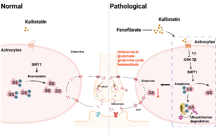 2024年3月14日,中山大學中山醫學院齊煒煒、高國全、楊霞教授團隊在Pharmacological Research上發表了題為“Kallistatin leads to cognition impairment via downregulating glutamine synthetase”的研究論文。該研究基于GEO數據庫、臨床樣本分析、轉基因小鼠模型驗證等,證明了AD患者血清中Kallistatin含量顯著增多;明確了KAL-TG小鼠出現記憶認知功能、海馬突觸可塑性下降及谷氨酸穩態失衡,證明過表達kallistatin通過破壞谷氨酸-谷氨酰胺循環誘發谷氨酸興奮性毒性;分子水平上,發現Kallistatin通過調節谷氨酰胺合成酶(GS)的乙酰化-泛素化修飾來促進其降解。GS激動劑可以有效改善KAL-TG小鼠的突觸可塑性及記憶認知功能;傳統降脂藥物非諾貝特具有下調Kallistatin、上調GS,延緩小鼠記憶認知功能下降的效果。本研究為臨床上早期預防和治療AD提供了新的理論依據和干預靶點。