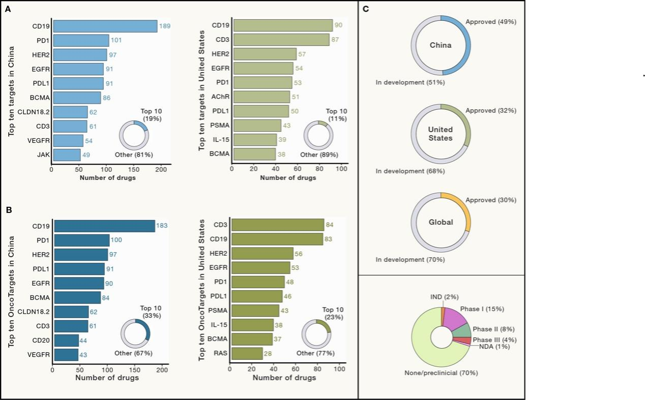 國內新藥開發仍存在靶點同質化的問題。眾所周知,新藥研發存在高成本、長周期和低成功率等問題。許多本土生物制藥公司會因投入產出的考量,選擇開發較少風險的成熟靶點或者更快速的仿制藥,導致國內藥物研發面臨靶點重復和適應范圍重疊的問題(圖2)。臨床醫生和基礎科學家之間的有效溝通和合作仍然不足,中國開發的抗腫瘤藥物大多來自于企業,來自院校和學術界的貢獻相對較小,企業主導的臨床研究對生物標志物或科學問題的探索也有限。中國的醫生培養體系中,缺乏經過系統培訓、同時精通臨床和基礎研究的醫學科學家。此外,國內企業的國際競爭力以及區域間醫療資源的分配仍有待進一步提高。