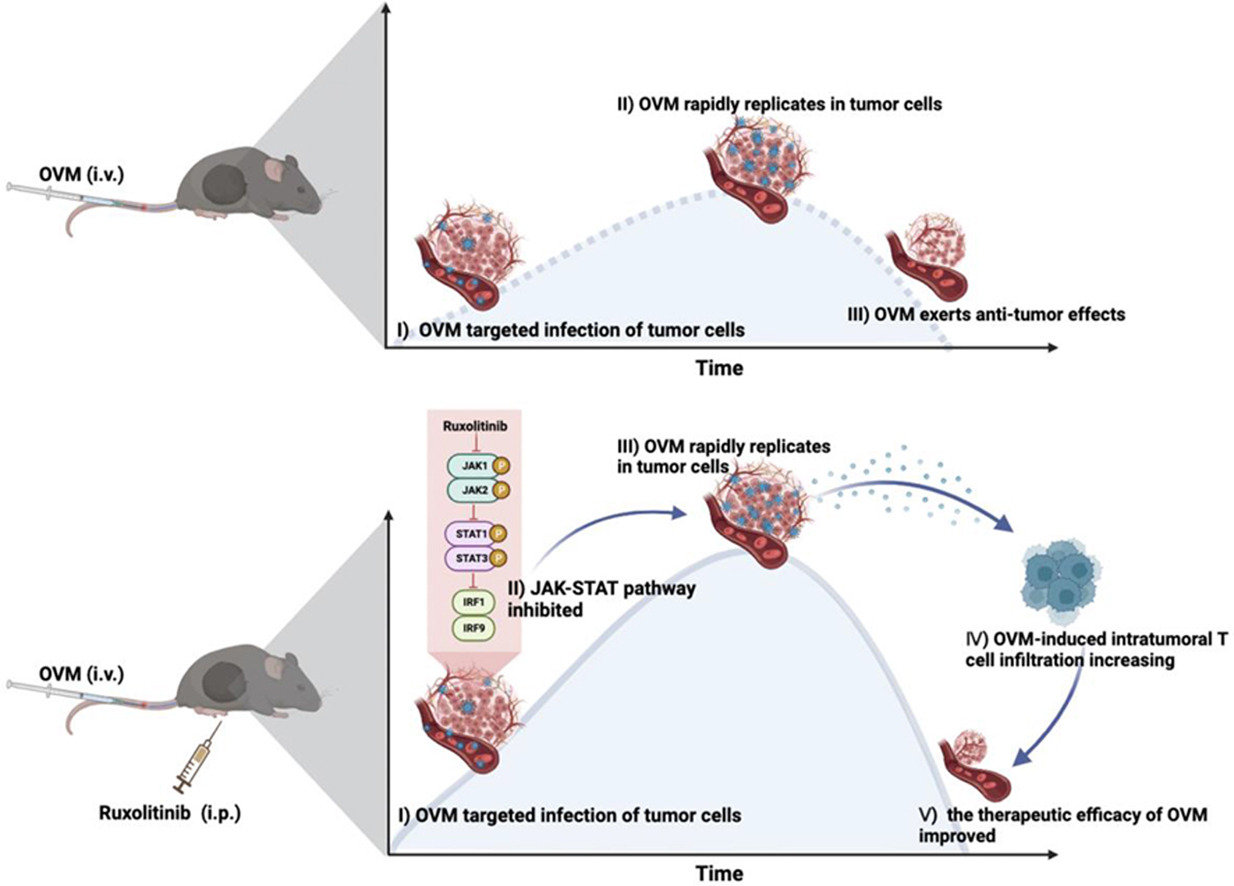 顏光美教授團隊長期致力于溶瘤病毒的M1的高效抗癌研究,于2014年首次將其鑒定為一種新型溶瘤病毒,并圍繞其選擇性抗癌的機制開展了系列研究,推動其在中國和日本進入臨床試驗,并在美國獲肝癌和膠質瘤的孤兒藥資格認定。在本研究中,研究人員系統解析了溶瘤病毒M1在免疫健全小鼠體內的藥動學特征,并鑒定了JAK-STAT通路對其分布和代謝起關鍵調控作用。在此基礎上,研究人員通過使用臨床藥物魯索替尼成功改善了溶瘤病毒M1的藥動學特性,進一步提升了其抗腫瘤療效和機體免疫激活水平。