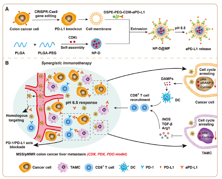 針對結腸癌肝轉移瘤的免疫抑制微環境,研究團隊利用CRISPR-Cas9技術敲除腫瘤細胞膜表面PD-L1蛋白,提取細胞膜囊泡,并用其制備工程細胞細胞膜修飾的仿生納米藥物,共同遞送細胞周期蛋白依賴性激酶1/2/5/9抑制劑(CDKi)和PD-L1抗體。該納米藥物通過工程化細胞膜(CCM)介導的腫瘤同源靶向和PD-L1抗體介導的主動靶向實現肝轉移瘤的精準遞送,靶向腫瘤微環境中的癌細胞及腫瘤相關髓系細胞(TAMC),捕獲G2/M細胞周期,誘導癌細胞免疫原性死亡,促進CD8+ T細胞浸潤,將“冷”腫瘤轉變為“熱”腫瘤;同時,抑制TAMC,逆轉免疫抑制微環境,增敏MSS/pMMR結腸癌肝轉移的ICB治療效果。該靶向治療體系在結腸癌肝轉移(PDX)模型及人源類器官模型中具有同樣的協同免疫治療效果。